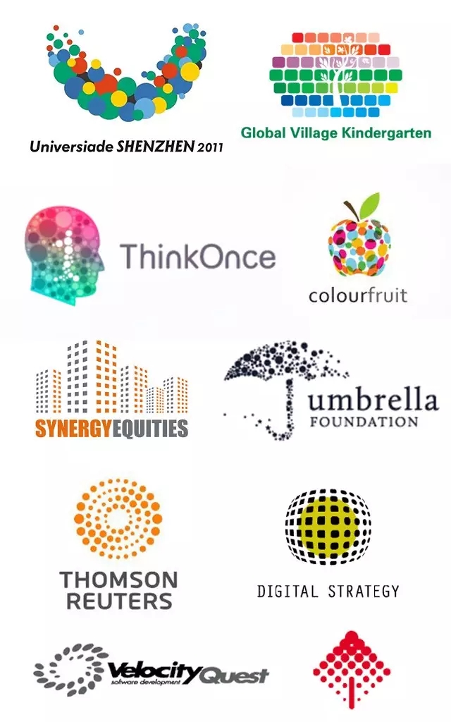 用点来拼成某一图形也是标志设计中常用的表现手法,多个点组合在一起除了形式上好看之外,而且很有动感,寓意也多,,如:汇聚、众多、生命、数码等。