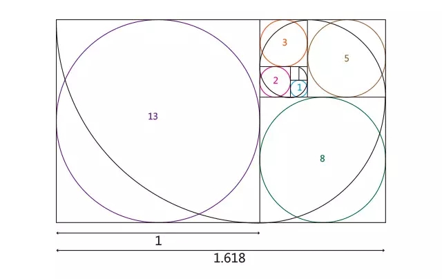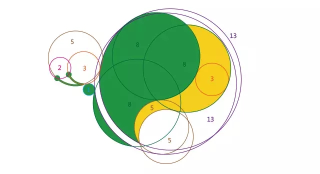 1.利用黄金分割法画出斐波那契螺旋线,其实我们经常要用到的不是这条曲线,而是框框里的几个圆,按照斐波那契数列在圆中标好序号得到下图;