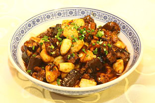 地道的周庄家常菜。将猪肉之精腿肉加调料剁细后与野菜一起塞入豆制品油卜中再烹饪,外形金色饱满,入口后鲜美的肉和汤汁顿觉醇香鲜嫩,别具风味。