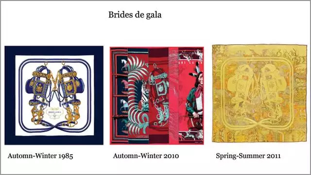 做奢侈品品牌,其实做的是自己的风格。图片上展示的是我们在不同年代生产的几款围巾,左边这款产自1985年;中间是2010年款,有些发展;右边是2011年款的围巾。可以看到这几款围巾在当时的审美观下都是最好看的,但更重要的是保持了爱马仕一贯的风格。